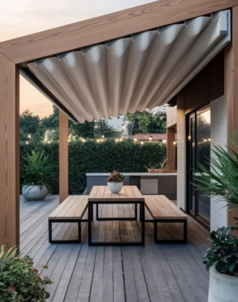 Essa estrutura contribui não apenas para o sombreamento eficiente, mas também para a organização da área e melhor aproveitamento de varandas, jardins e áreas gourmet.